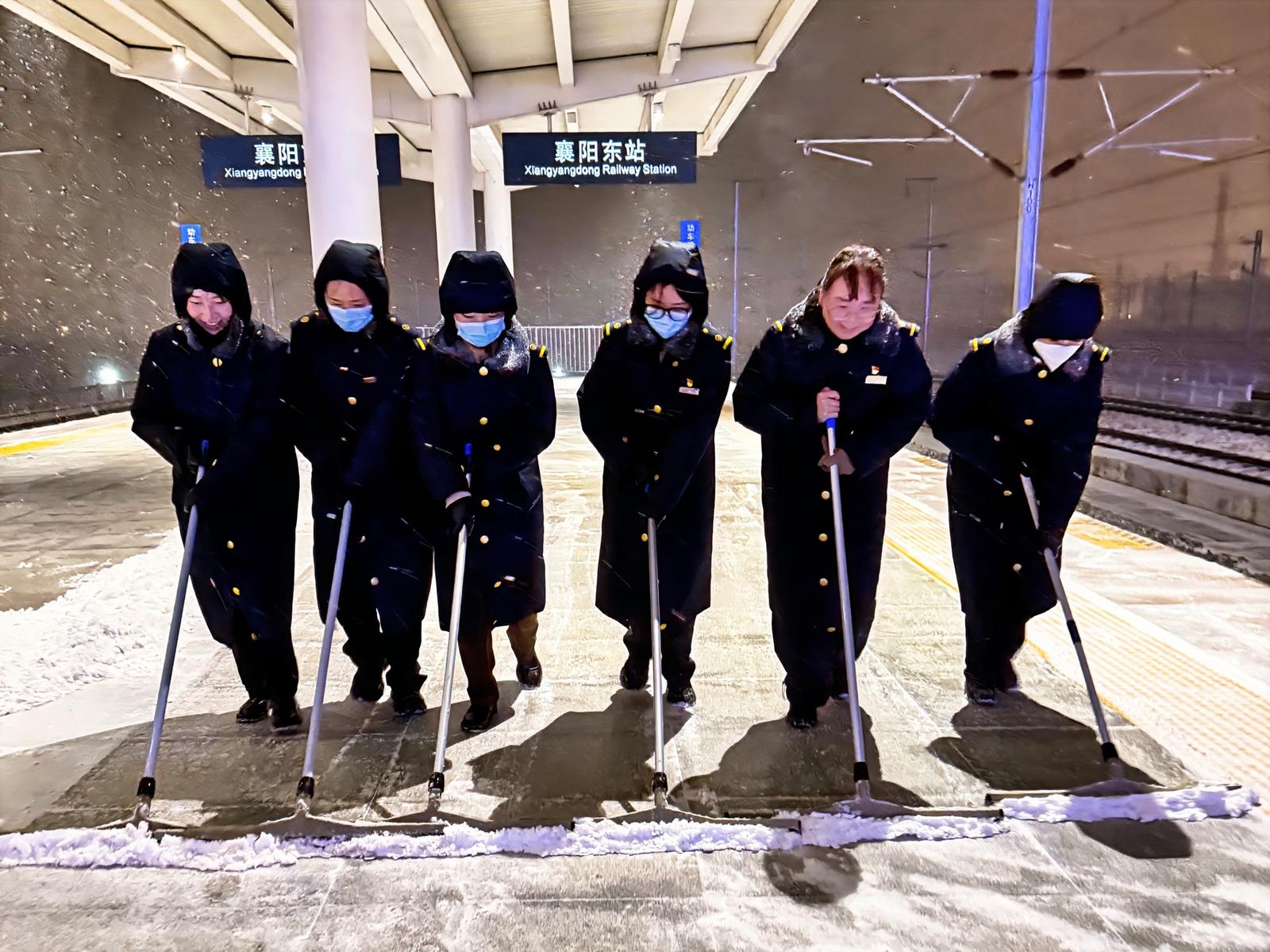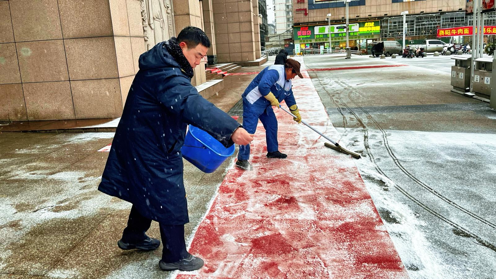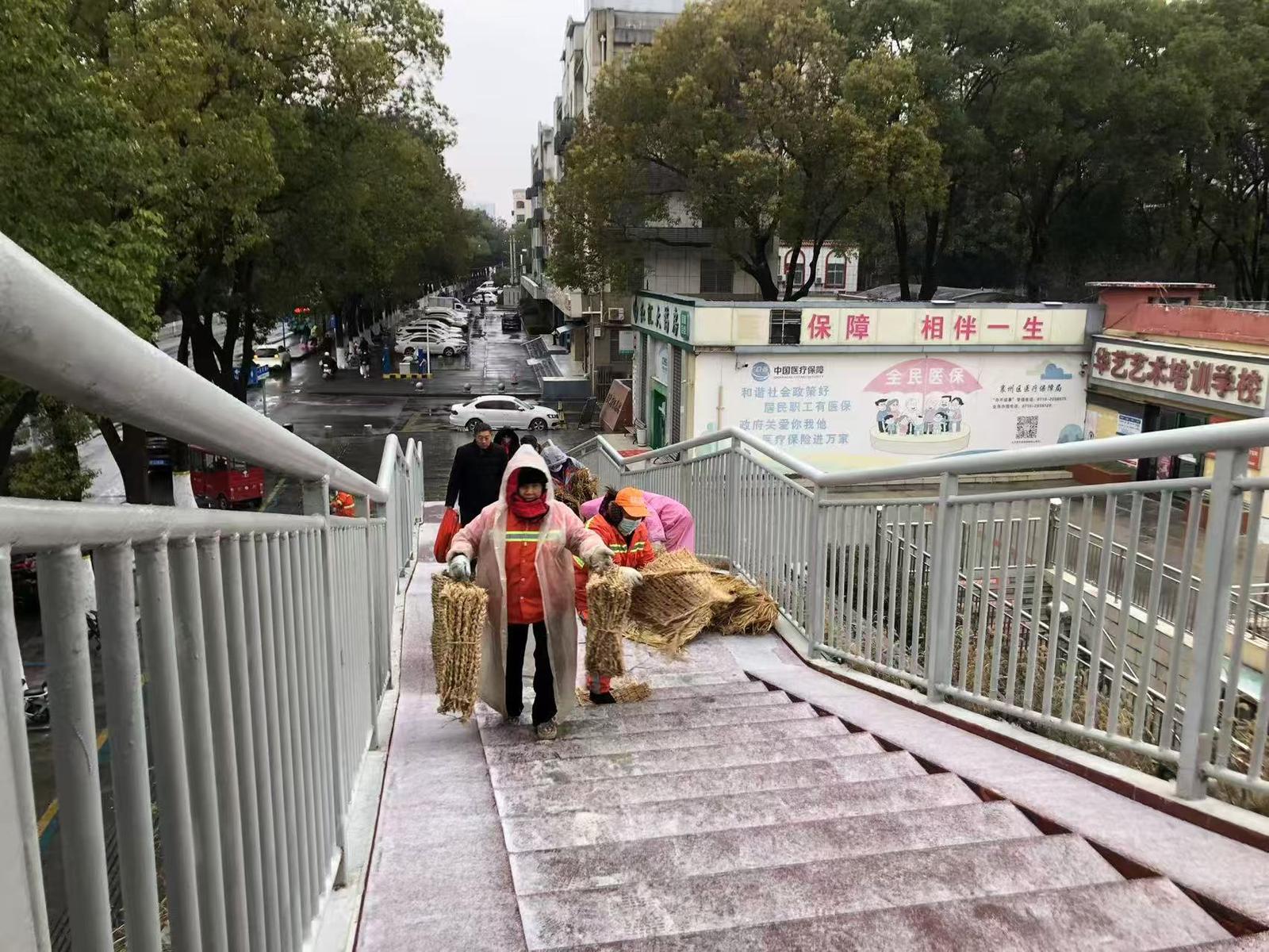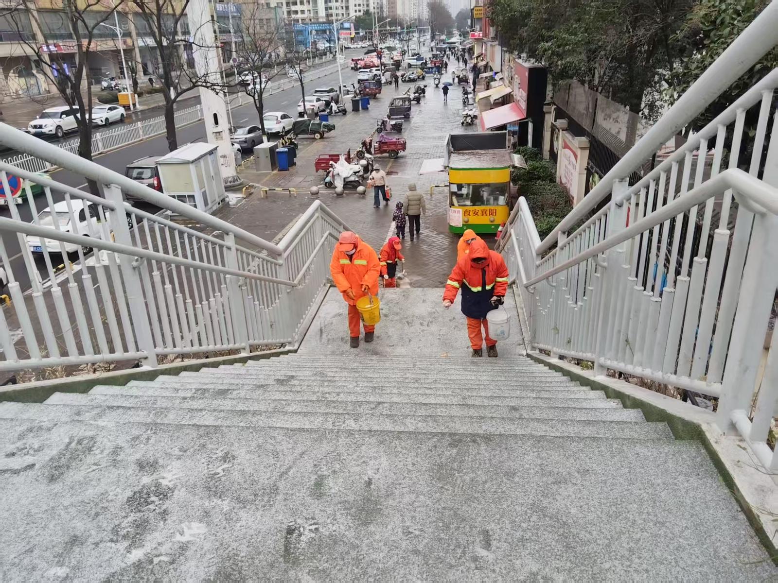 襄州区城管局:组织环卫工人对城区公交站台、天桥抛洒融雪剂,在城区各公厕周边铺设防滑草垫,为即将到来的大雪做好应对准备。