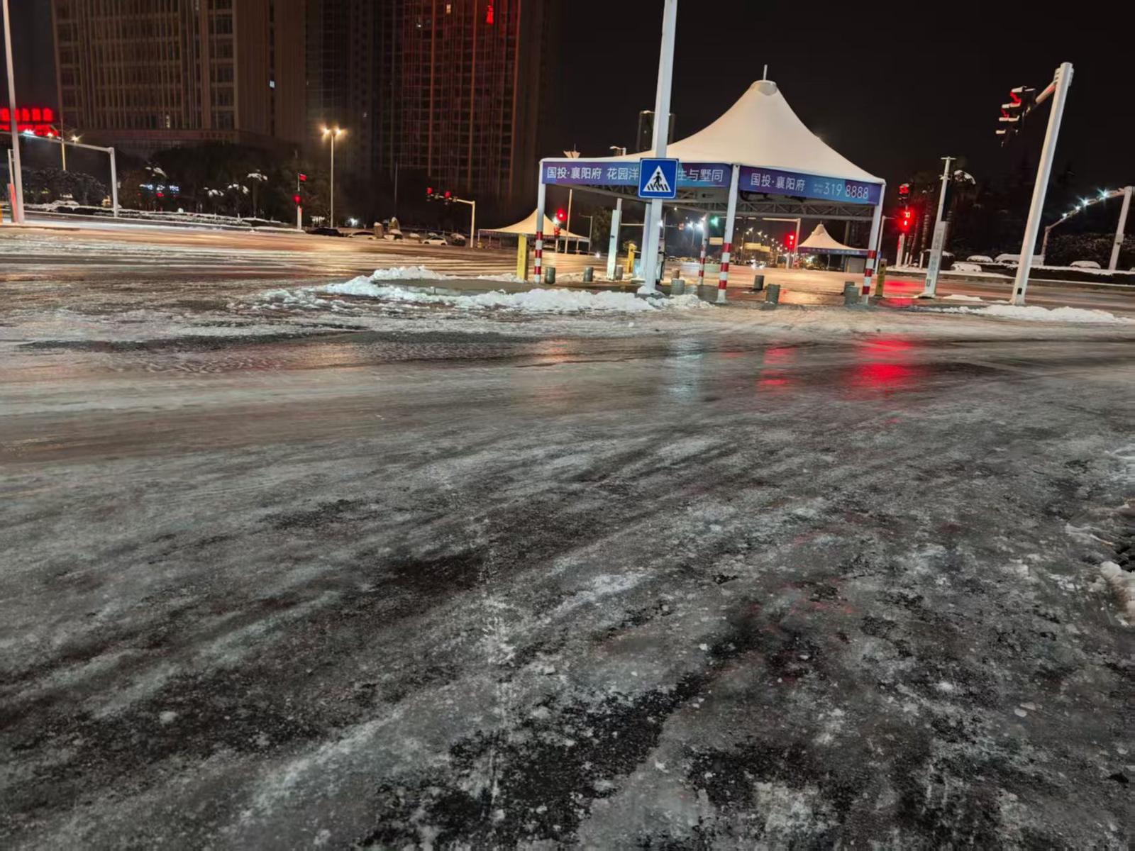 已结冰道路:丹江路涵洞有积雨结冰。黄龙至柏店道路中间结冰光滑严重。丹江路路南到鱼梁洲桥头结冰严重。花栋木店路面结冰,护校上坡己结冰。清河一桥樊城上桥处,结冰路滑。长征路桥双向结冰轻微。团山大道路面结冰现象严重。鹿门大桥,东津往市区方向上桥路段路面两侧积雪结冰硬化,中间路段有暗冰现象,转弯处有结冰现象。耀襄高中、凤凰管委会辅道有结冰。东风汽车大道全结冰。