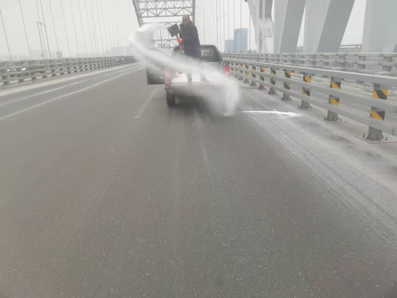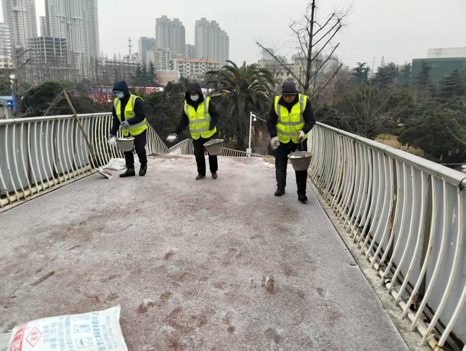 市政管理处:市区人行天桥铺设防滑垫撒布融雪剂,在高架撒布融雪剂。