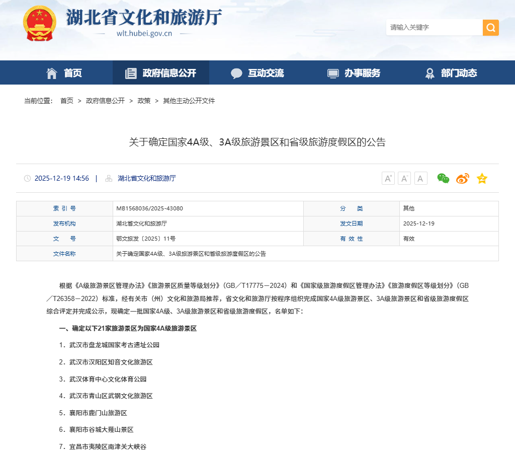 近日, 根据《旅游景区质量等级的划分与评定》(GB/T 17775-2024)和《旅游景区质量等级管理办法》,经市(州)文化和旅游局初评推荐,湖北省文化和旅游厅组织评定:襄阳鹿门山景区、襄阳市谷城大薤山景区达到国家4A级旅游景区标准,晋升为国家4A级旅游景区!