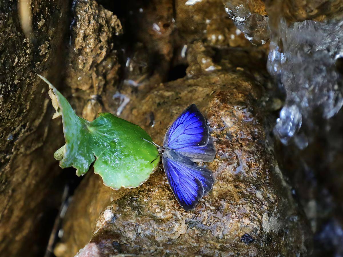 张保兴介绍,当时他正在蜡梅谷拍摄自然生态景观,无意间瞥见林间有褐色小蝶穿梭,其翅膀反面密布的云朵状褐色波纹极具辨识度。“这只蝴蝶体型不大,飞行姿态轻盈,落在水边石头上时,翅膀腹面的保护色能很好地与环境融合,不仔细观察很难发现,而背面的金属蓝色又十分靓丽。”