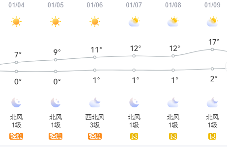 1月5日晚到6日:晴天,偏北风3~4级,1~11℃