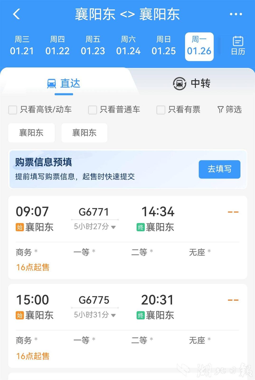 铁路12306APP显示,1月26日起,铁路部门将开通“襄阳东至襄阳东”环线列车。车次每天2趟,分别为G6771、G6775。