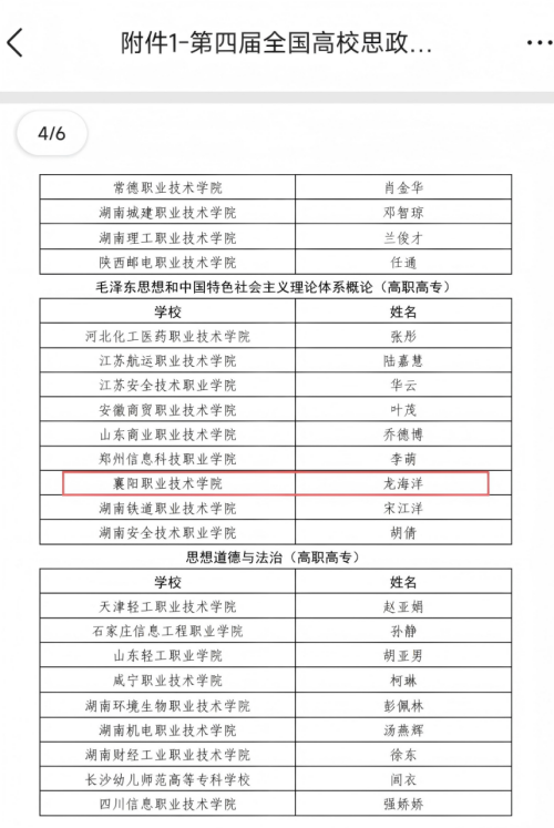 近日,教育部公布第四届全国高校思想政治理论课教学展示活动现场教学展示入围教师名单,共有119个教学团队入围。其中,本科院校81个,高职高专院校38个。襄阳职业技术学院马克思主义学院龙海洋《毛泽东思想和中国特色社会主义理论体系概论》课程教学团队成功入选。