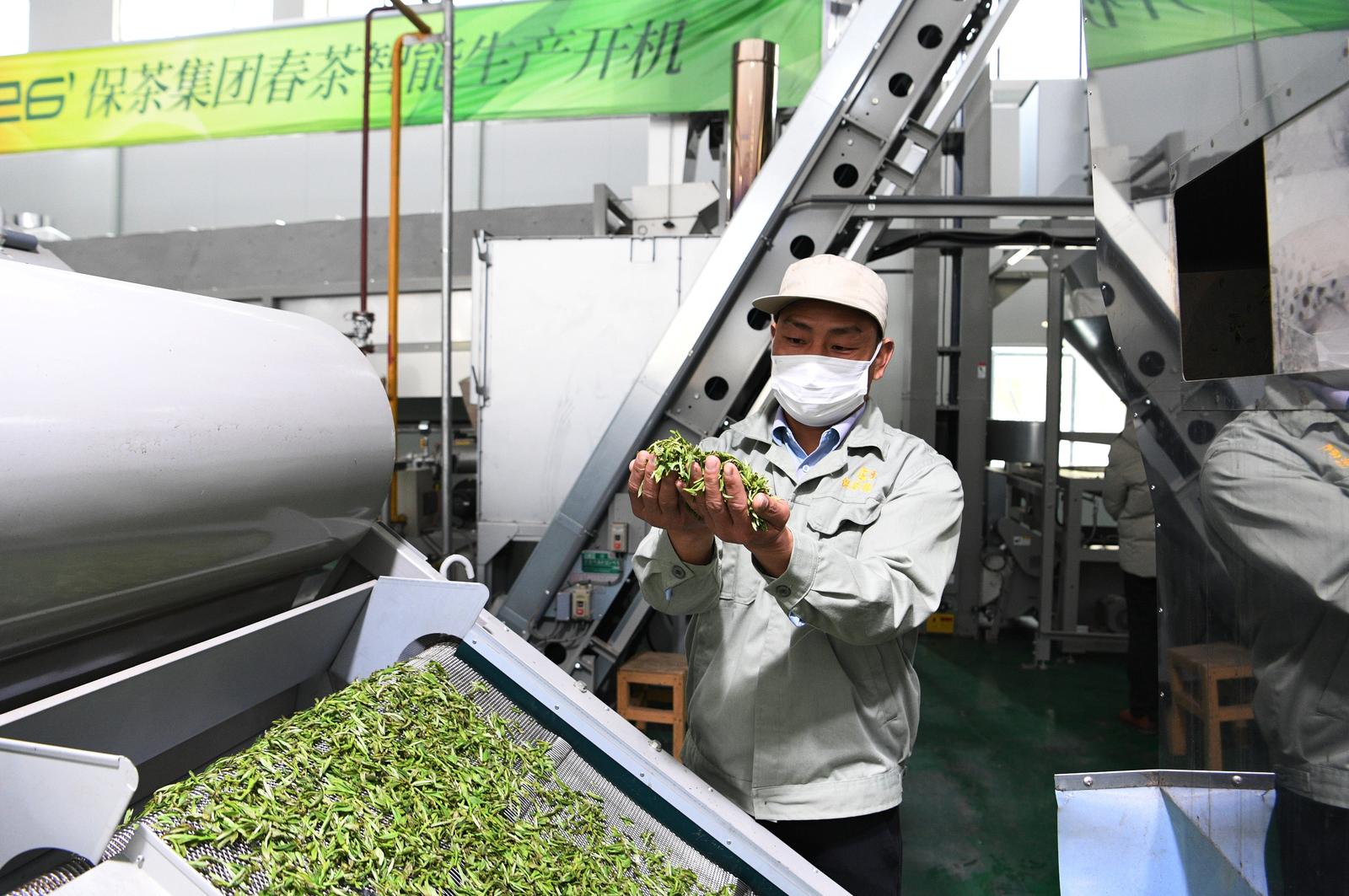 在保茶集团智能化加工车间,一条全自动名优茶生产线正全速运转,每一道工序都由系统精准控制,大屏上实时跳动着温度、湿度、时长等数据。